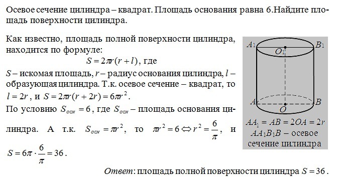 Осевое сечение цилиндра-квадрат.Площадь основания равна 6.Найдите площадь поверхности цилиндра.