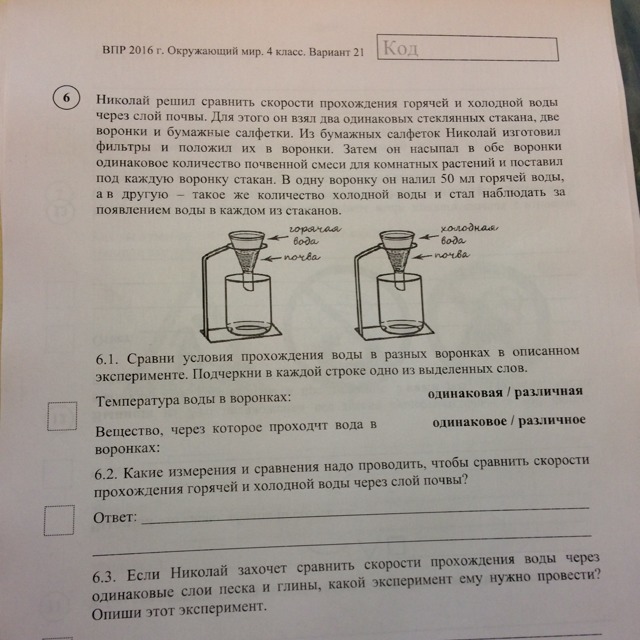 Температура разная. Вещество, через которое проходит вода в воронках: одинаковая.
