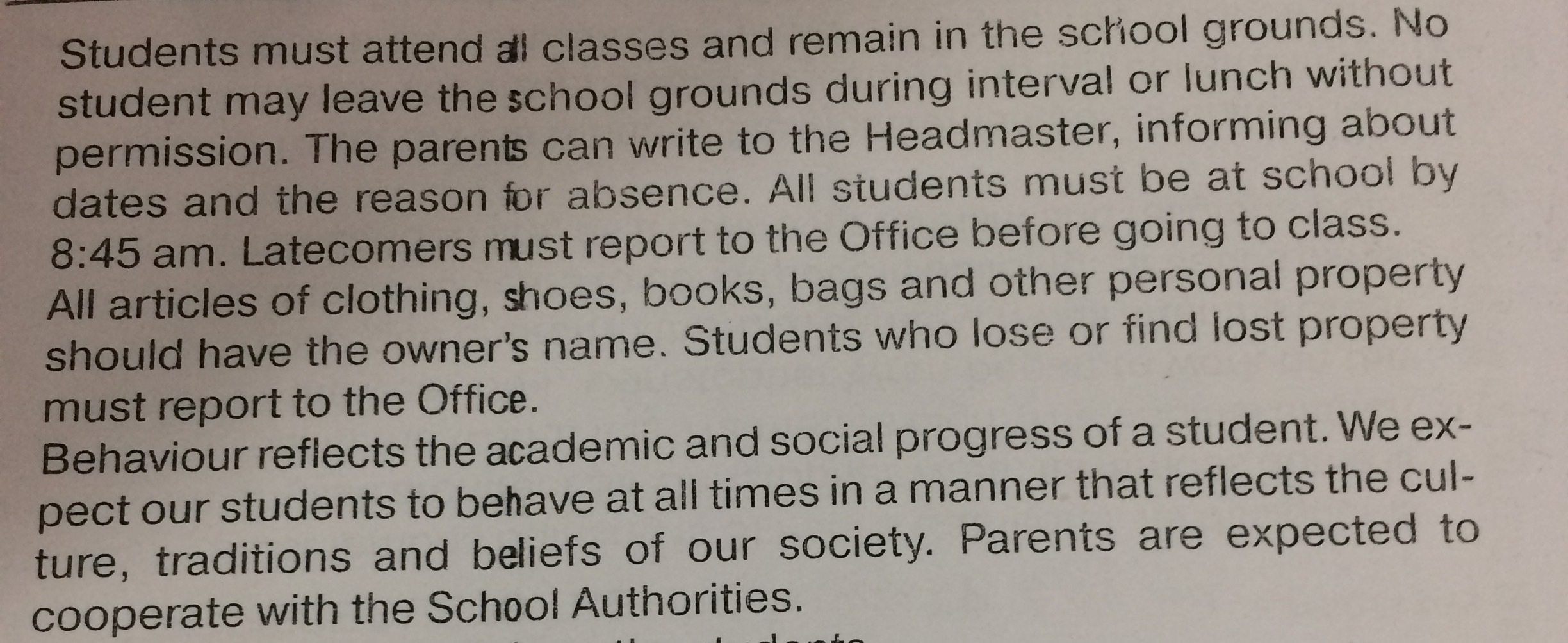 Студенты должны посещать все классы и оставаться на территории школы. Без разрешения студент не может покидать территорию школы во время перерыва или обеда. Родители могут написать Директору, сообщив о датах и причине отсутствия. Все! Студенты должны быть в школе к 845 утра. Опоздавшие должны отчитываться перед Управлением перед тем, как идти в класс. Все предметы одежды, обувь, книги, сумки и другая личная собственность должны иметь имя владельца. Студенты, потерявшие или потерявшие собственность, должны отчитываться перед Бюро. Поведение отражает академический и социальный прогресс студента. Мы ожидаем, что наши ученики будут вести себя во все времена так, чтобы отражать культуру, традиции и верования нашего общества. Предполагается, что родители будут сотрудничать со школьными властями.