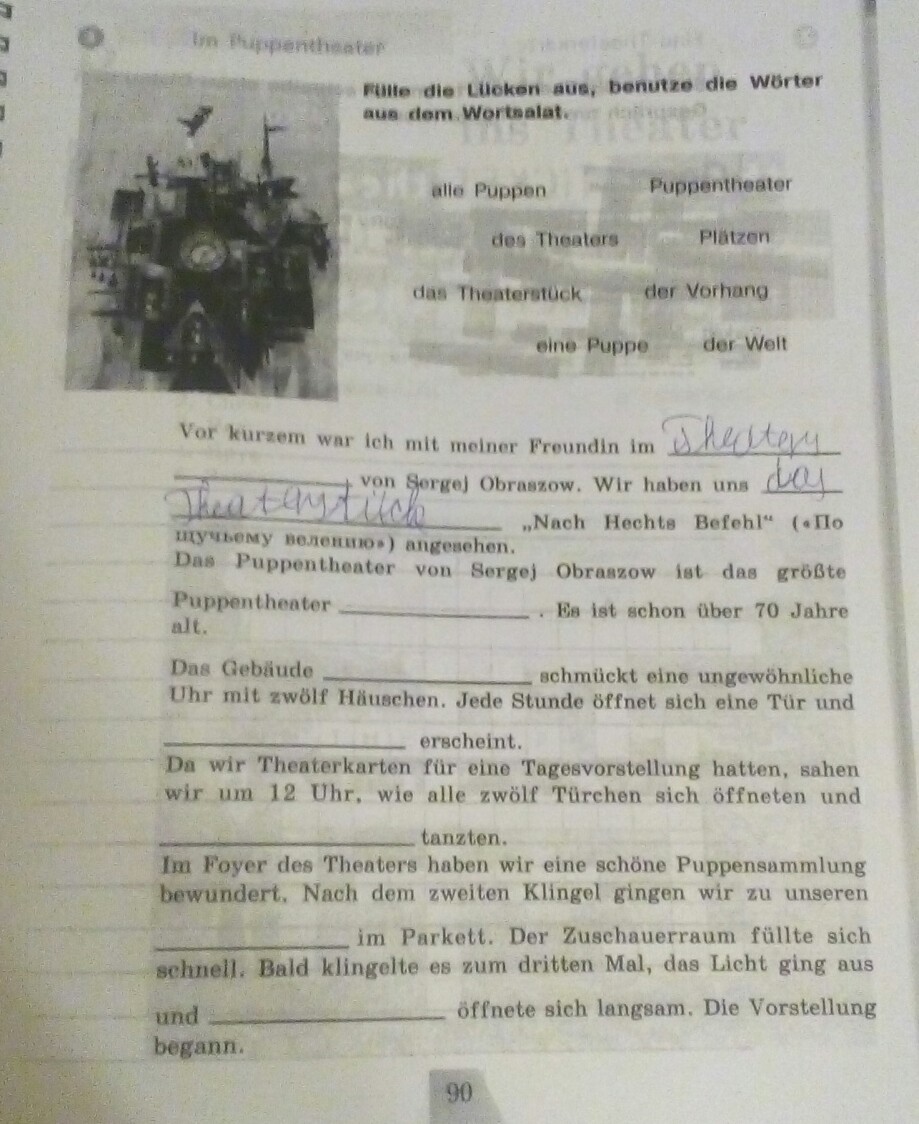 1.im Puppentheater 2.das Theaterstück 3.der Welt 4.des Theaters 5.eine Puppe 6.alle Puppen 7.unseren Plätzen 8. der Vorhang