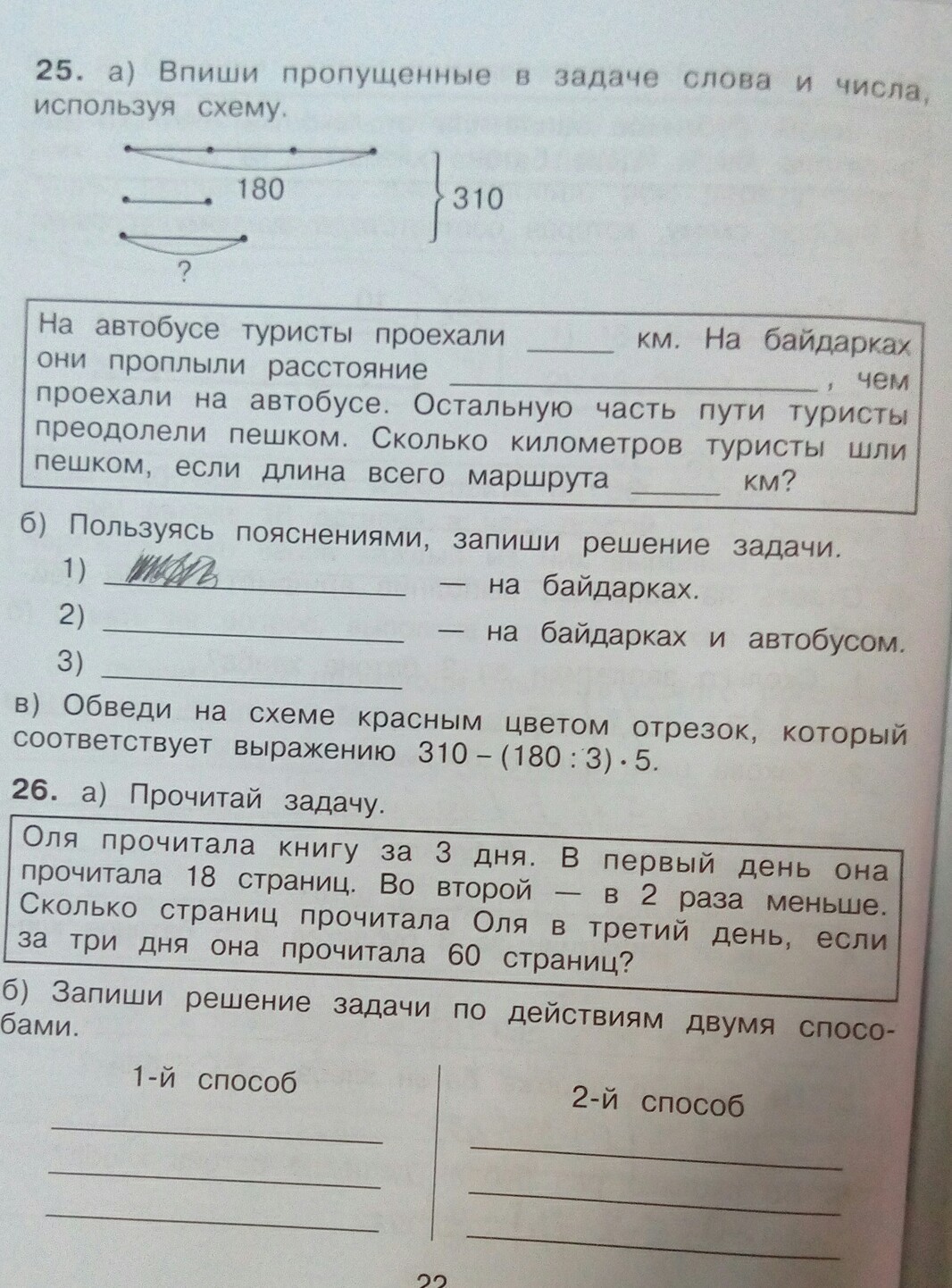 25а).На автобусе туристы проехали 180 км.На байдарках они проплыли расстояние в 3 раза меньшее,чем проехали на автобусе.Остальную часть пути туристы преодолели пешком.Сколько км туристы шли пешком,если длина всего маршрута 310 км?