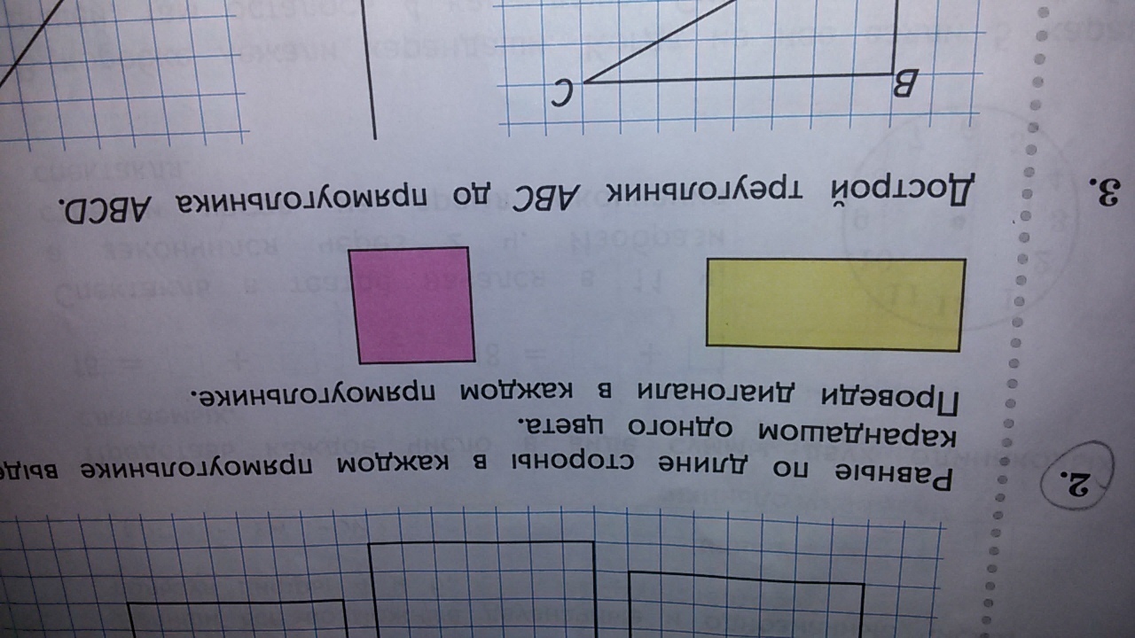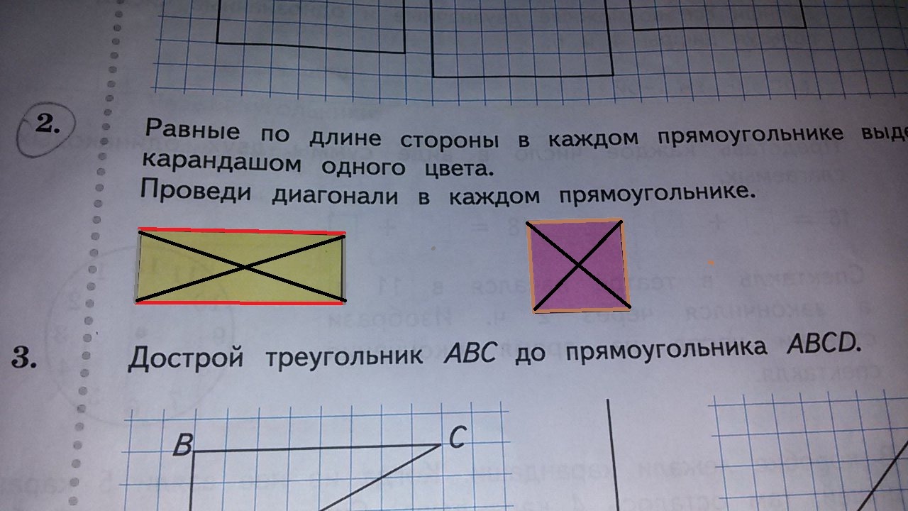 равне подлине стороны в каждом прямоугольнике выдели карандошом одного чвета проведи диагонали в каждом прямоугольнике
