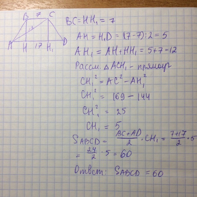 Хелп) Плиз) Основания раынобокой трапеции равны 7 и 17 см, а диагональ - 13 см. Найти площадь трапеции. Дам 20 балов)