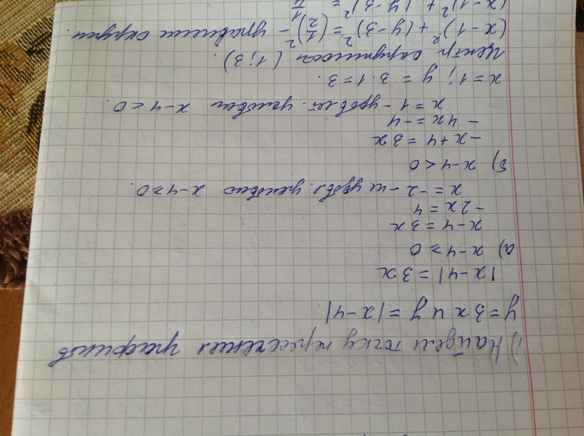 уравнение окружности с центром в точке пересечения графиков функций y=3x и y=|x-4| радиусом r=1/2