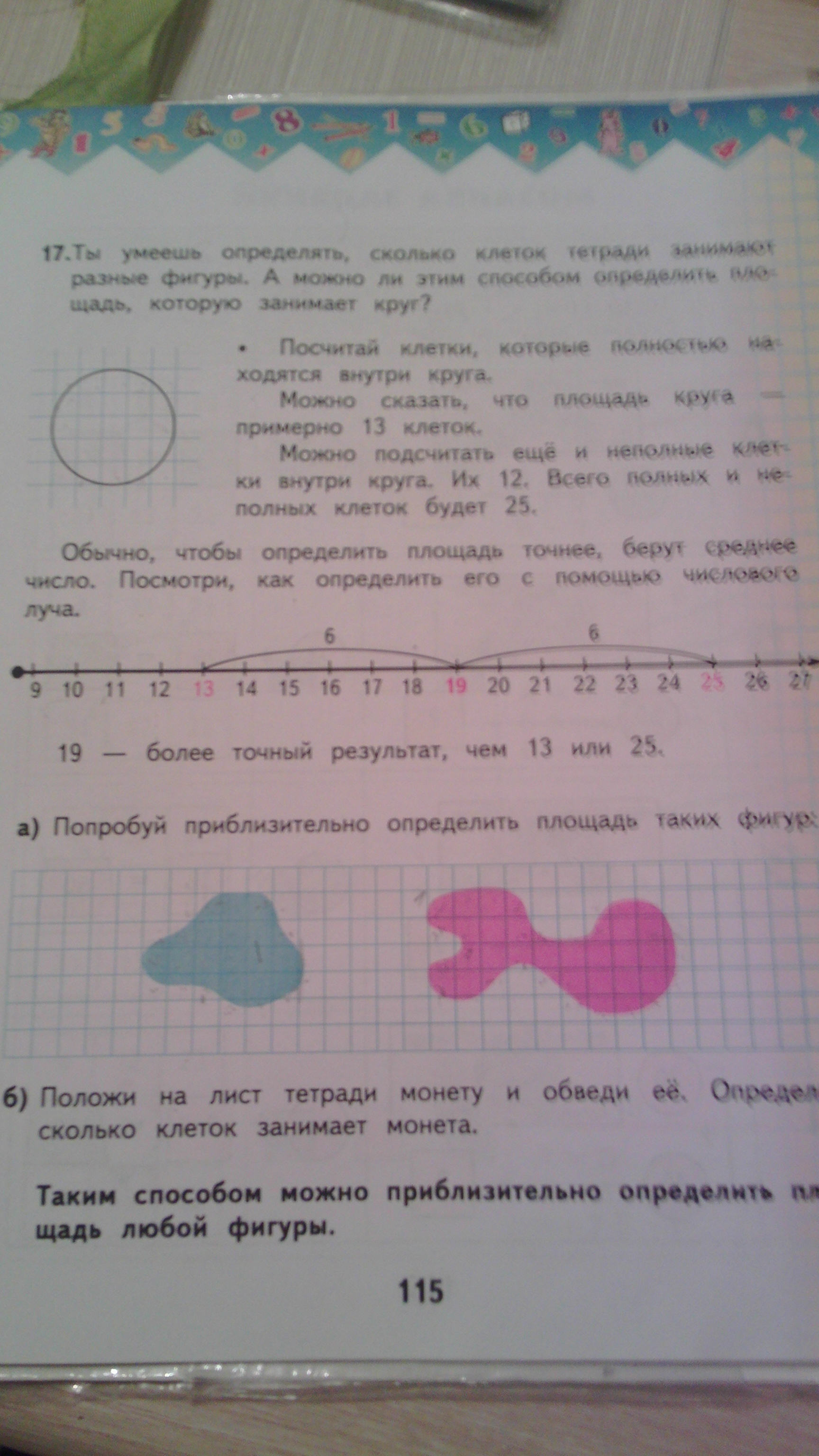 посчитай сколько клеток входит в круг и вот приблизительно площадь насчет луча не очень понимаю с другими фигурами тоже самое что и с кругом