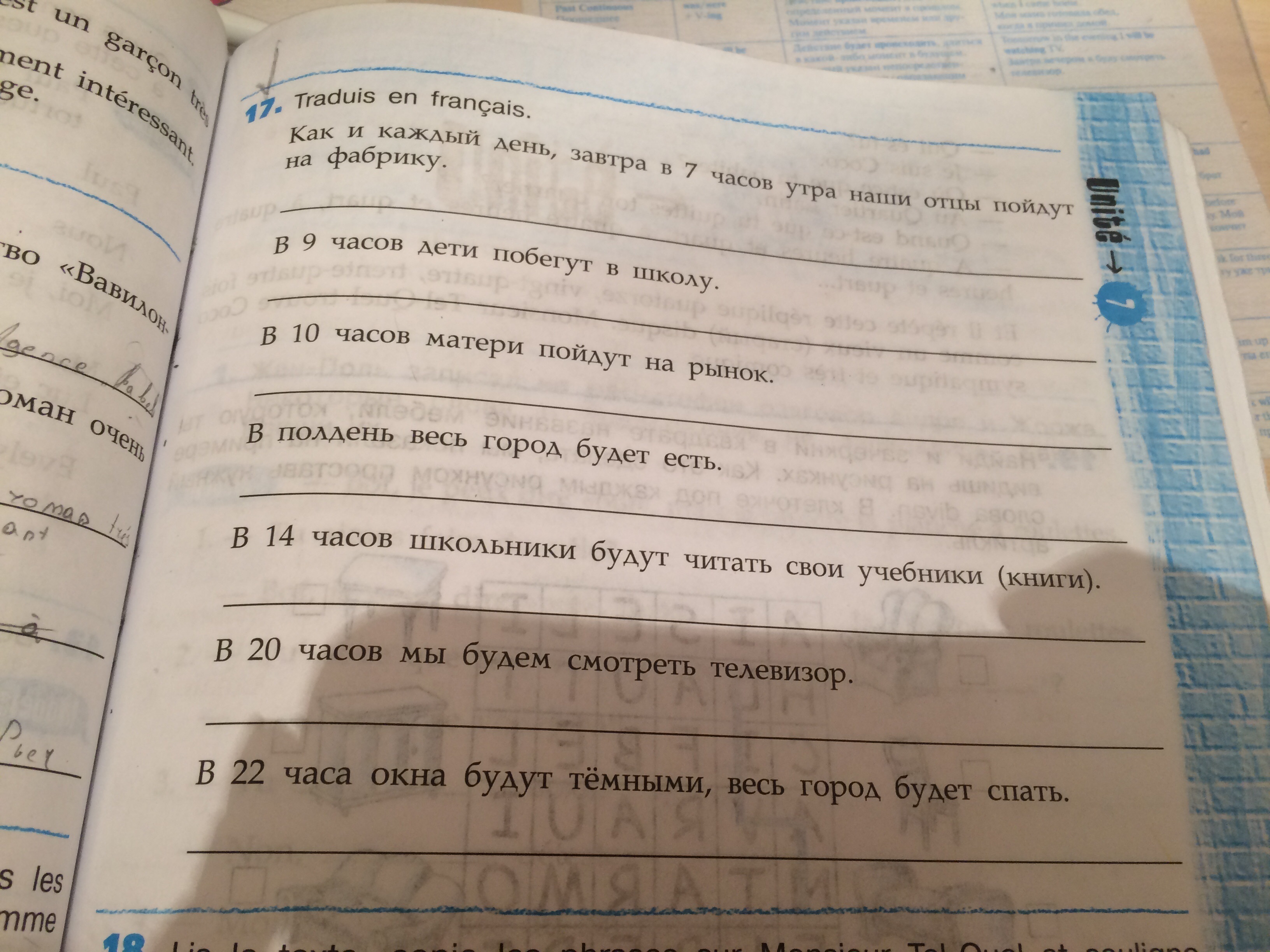 Traduis en français 1)Как и каждый день, завтра в 7 часов утра наши отцы пойдут на фабрику 2)В 9 часов дети бегут в школу 3)В 10 часов мамы пойдут на рынок 4) В полдень весь город будет есть 5)В 14 часов будут читать свои книги 6)В 20 часов мы будем смотреть теливизор 7)В 22 часа окна будут тёмными, весь город будет спать.