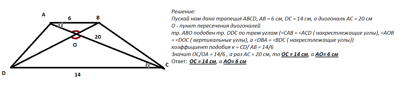Основы трапеции равны 6 см и 14 см, а одна из диагоналей равна 20 см. Найди отрезки, на которые эта дигональ делится точкой пересечения диагоналей.