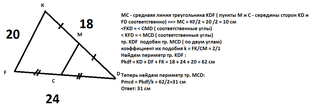 Найди периметр треугольника MDC, если KD=18 см,DF=24 см,KF=20 см