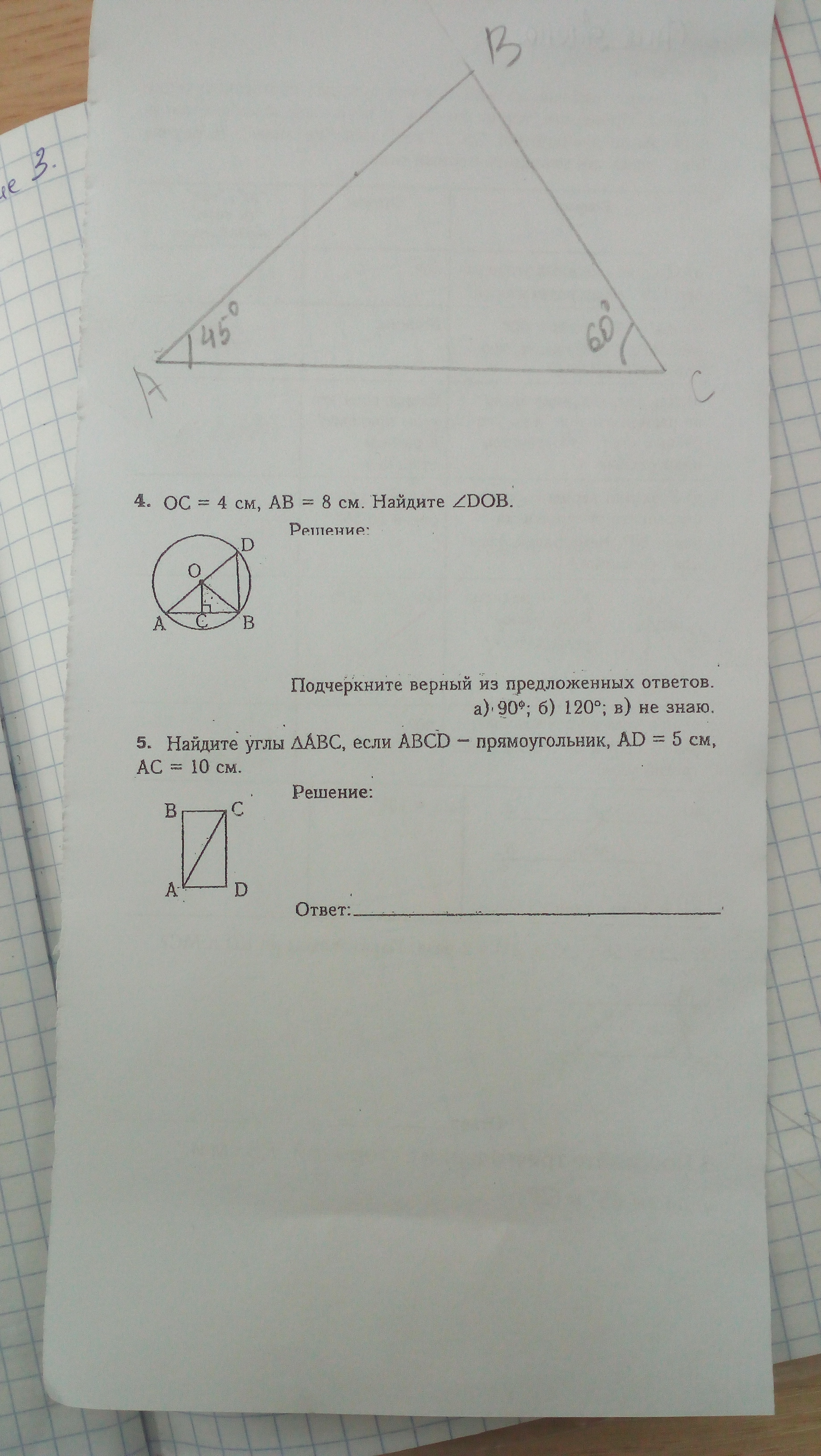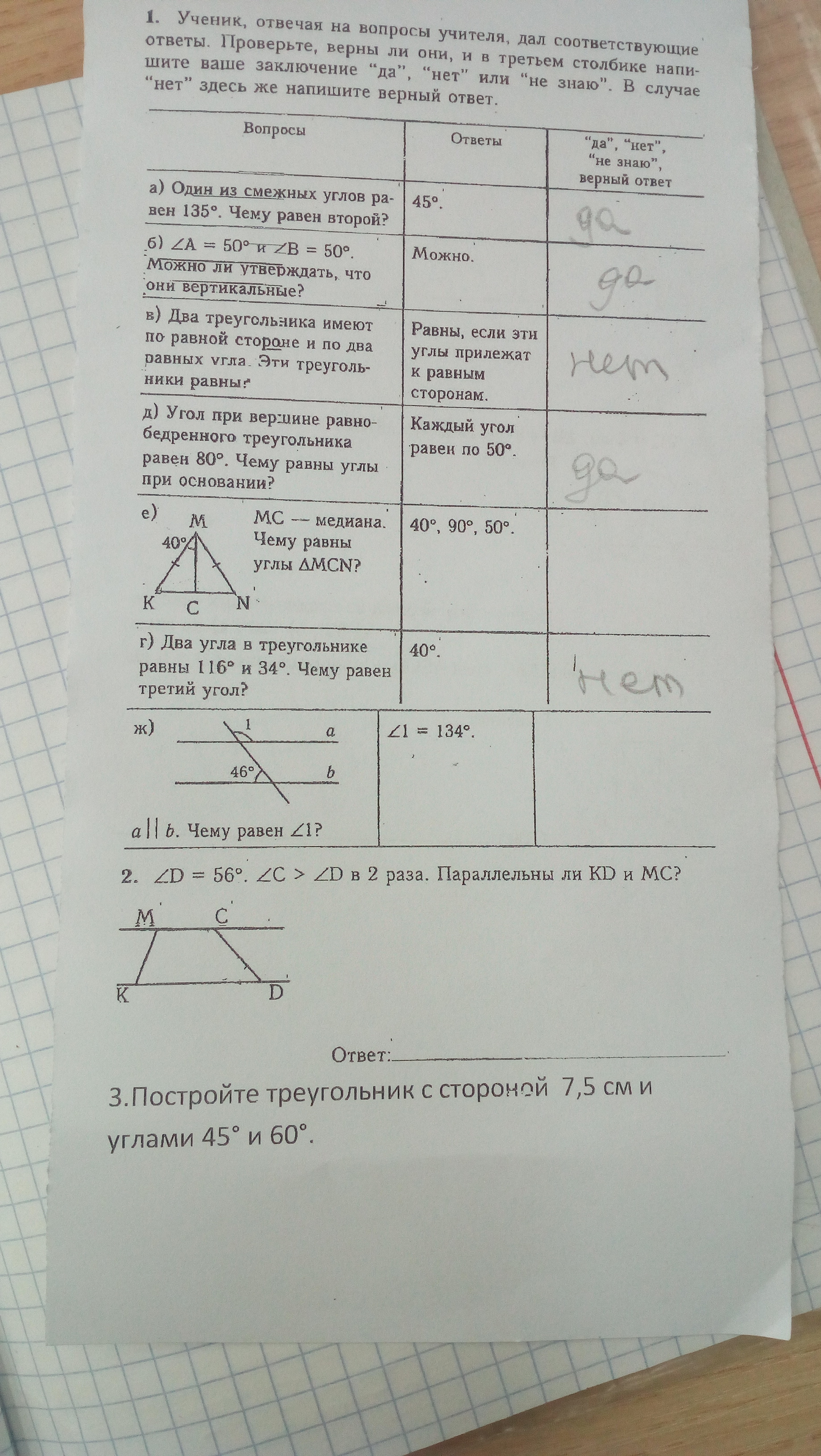3. тебе понадобится линейка и транспортир . откладываешь 7,5 см , затем два угла 45° и 60° на концах данного отрезка, протягиваешь их стороны до пересечения и получишь третью вершину.