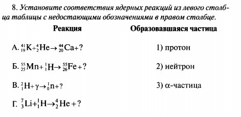 Установите соответствия ядерных реакций из левого столбца с недостающими обозначениями в правом столбце.