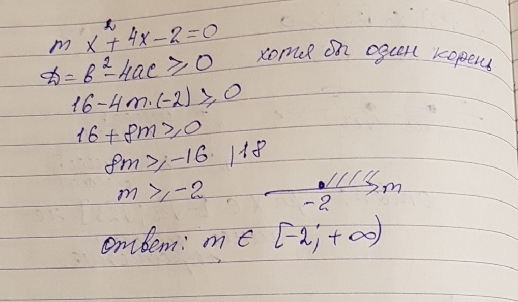 при каких значениях m уравнение имеет хотя бы один корень:mx в квадрате +4x-2=0