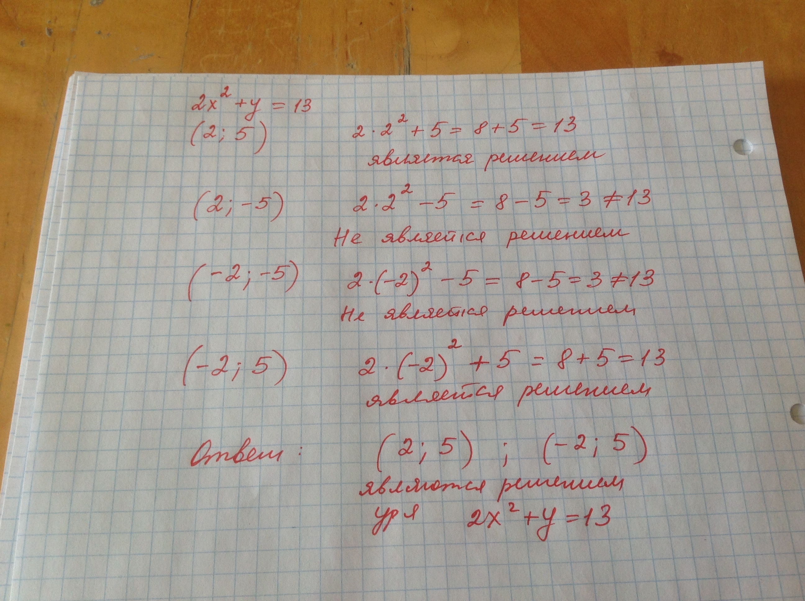 какие из данных чисел являются решением уравнения 2x^2+y=13 : (2;5) : (2;-5) : (-2;-5) : (-2;5) ? ПОМОГИТЕ ПОЖАЛУЙСТА.