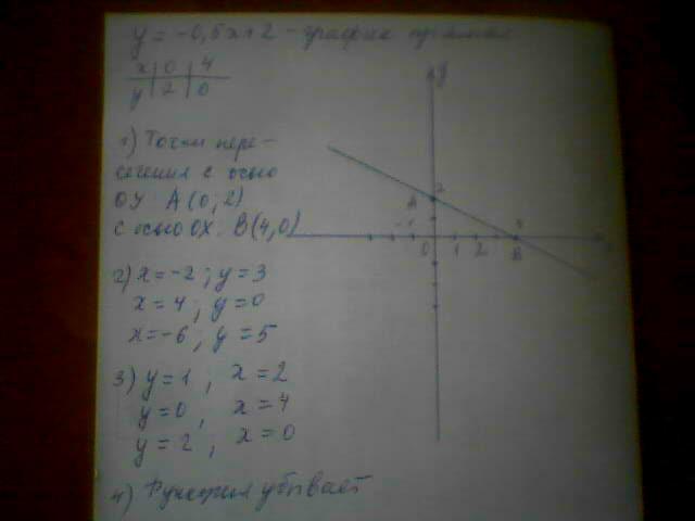 Построить график линейной функции y = -0,5x + 2. Найти: