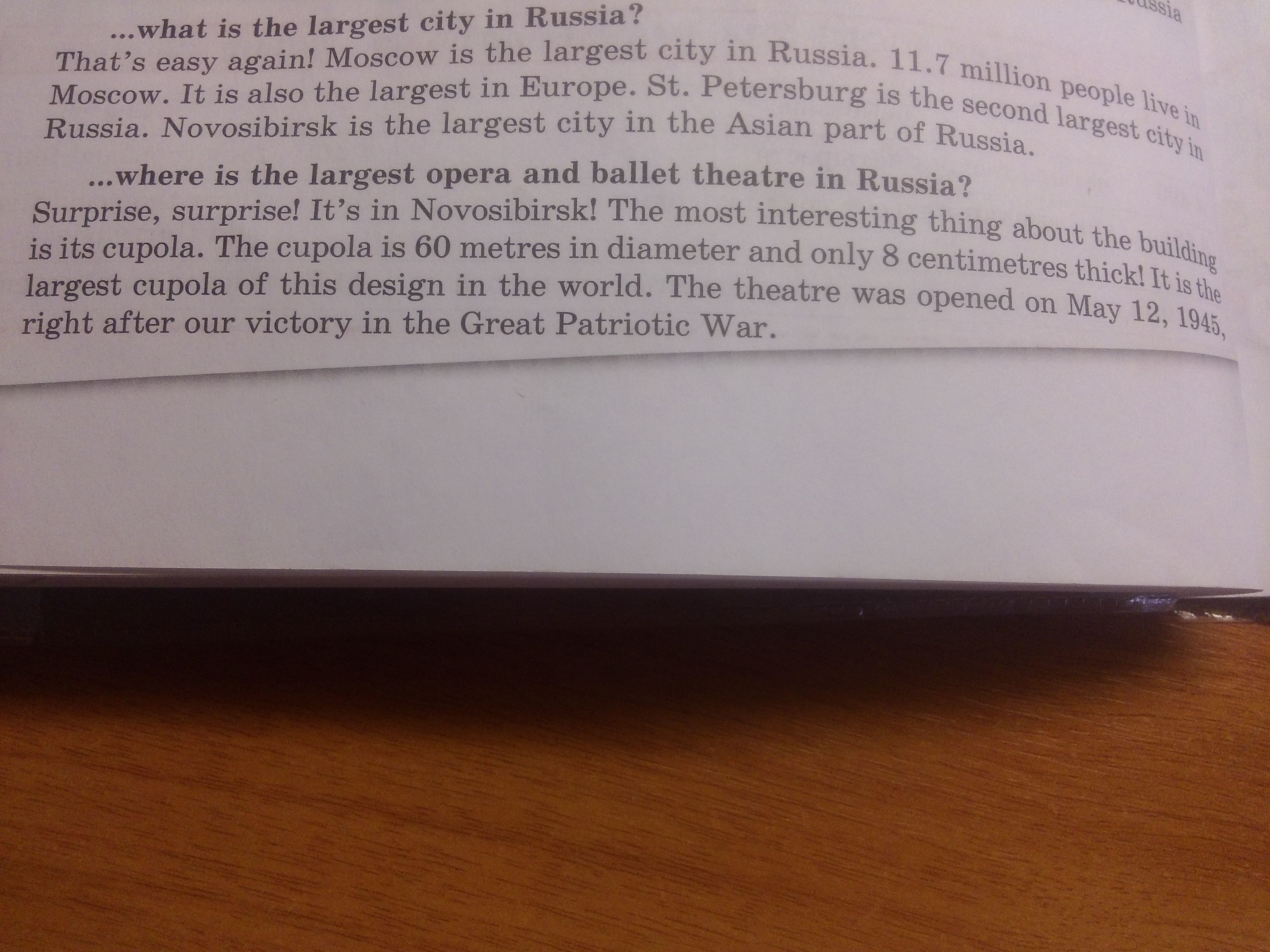 Это опять легко! Москва - самый большой город в России.11.7 миллионов людей живут в Москве. Это также является самым большим показателем среди всей Европы. Санкт-Петербург - второй по размерам город в России. А Новосибирск - самый большой город Азиатской части России.