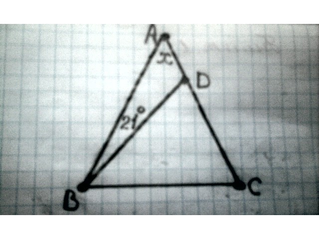 треугольник ВДС, а+а+21+а+21 =180, 3а+42=180, а=46 =уголДВУС, уголВ=уголС=46+21=67, уголА=х==180-67-67=46