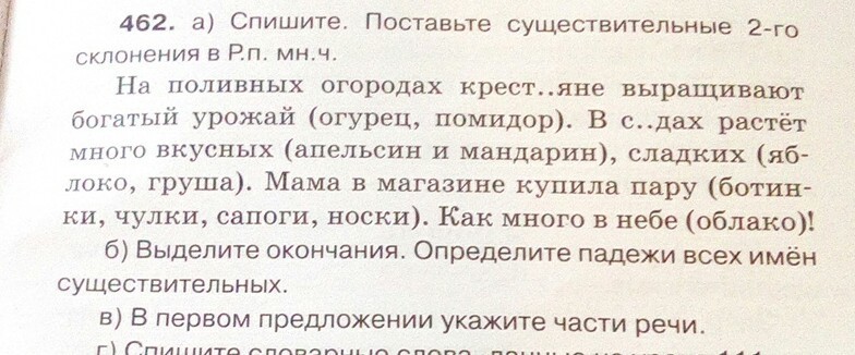 На поливных огородах крестьяне выращивают богатый урожай огурцов, помидор. В садах растет много вкусных апельсинов и мандаринов, сладких яблок, груш. Мама в магазине купила пару ботинок, чулков, сапогов, носков. Как много в небе облаков!