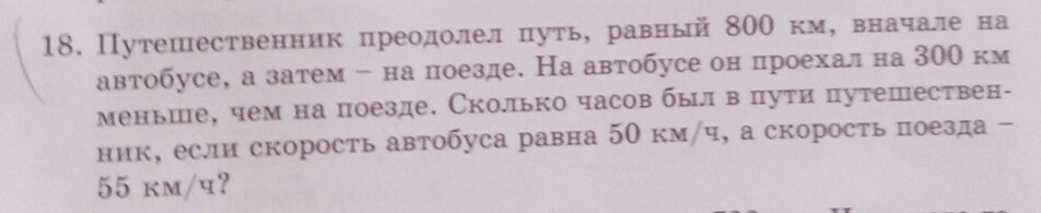 Пусть x=расстояние на автобусе, тогда x+300 на расстояние на поезде, x+(x+300)=800