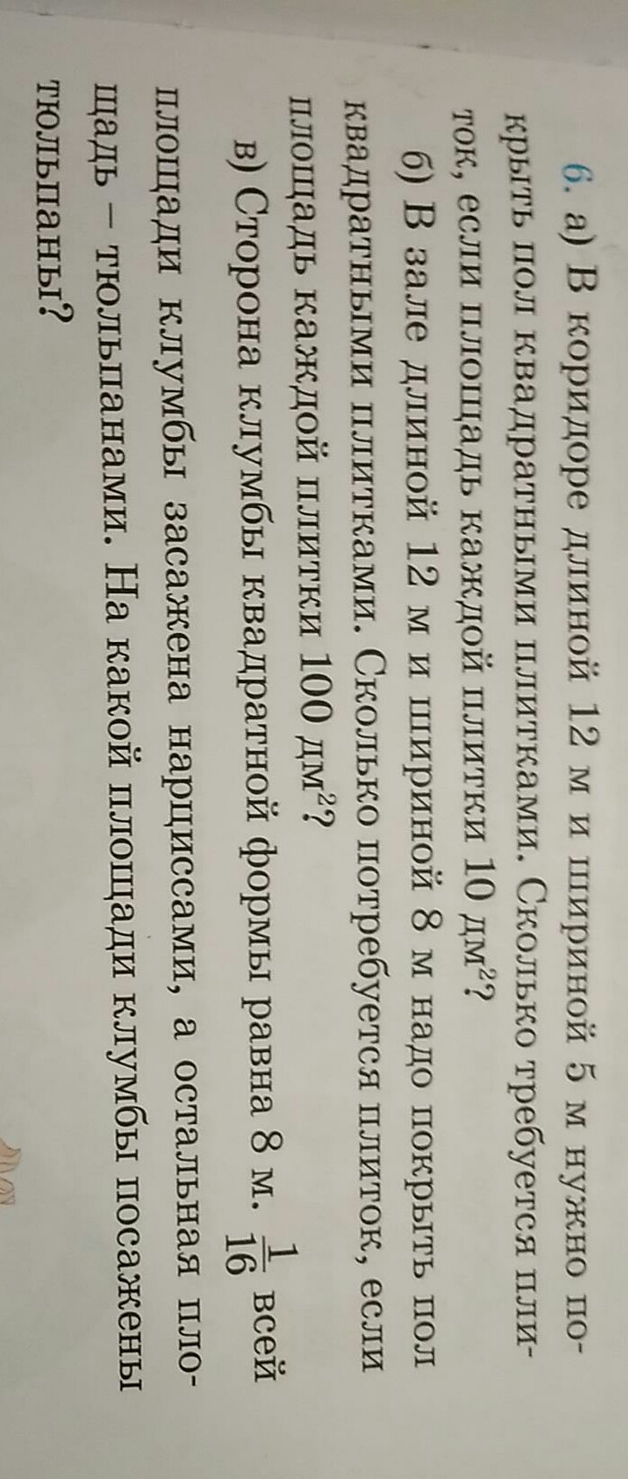 1.12*5=60 м2 площадь коридора 2. 2дм=0.2м сторона плитки 3.0,2*0.2=0.04м2 площадь 1 плитки 4.60/0.04=1500 плиток