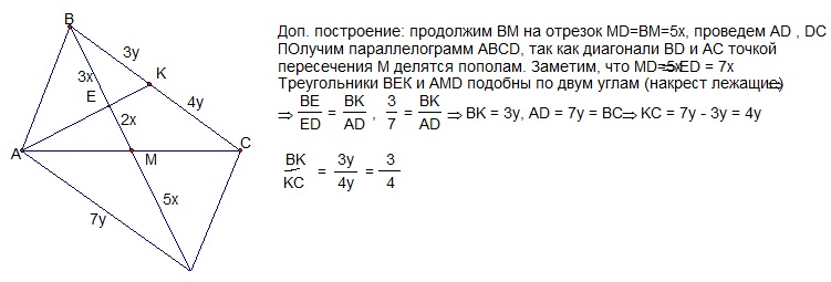 В треугольнике ABC на медиане BM отмечена точка E так,что BE:EM-3:2.Прямая AE пересекает сторону BС в точке К.В каком отношении точка К делит отрезок BC,считая от точки B?