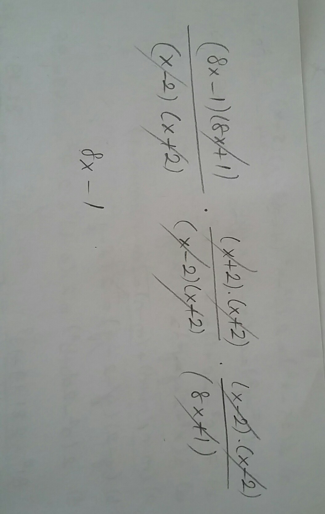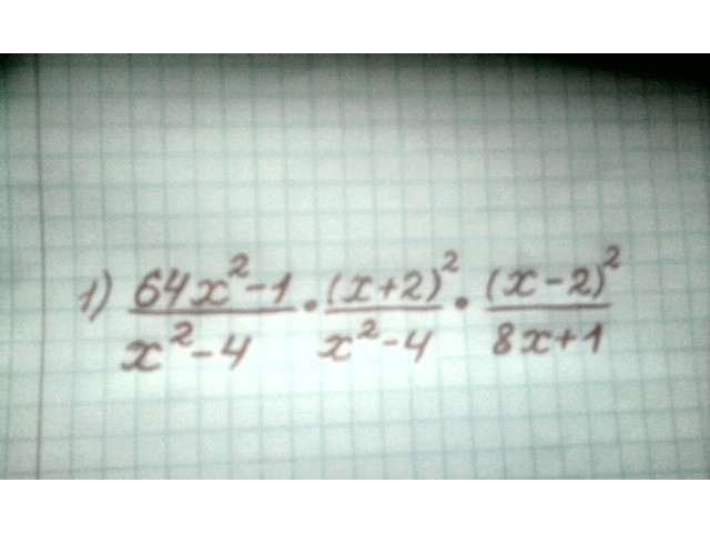 ((64x^2-1)/(x^2-4))*((x+2)^2/(x^2-4))*((x-2)^2/(8x+1))=((8x-1)(8x+1)(x+2)(x+2)*(x-2)(x-2))/((x-2)(x+2)(x-2)(x+2)(8x+1))=8x-1