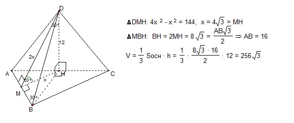 СРОЧНО! Основанием пирамиды является правильный треугольник. одна из боковых граней пирамиды перпендикулярна плоскости основания, а две других наклонены к ней под углом 60 градусов . Найдите объем пирамиды, если ее высота равна 12 см