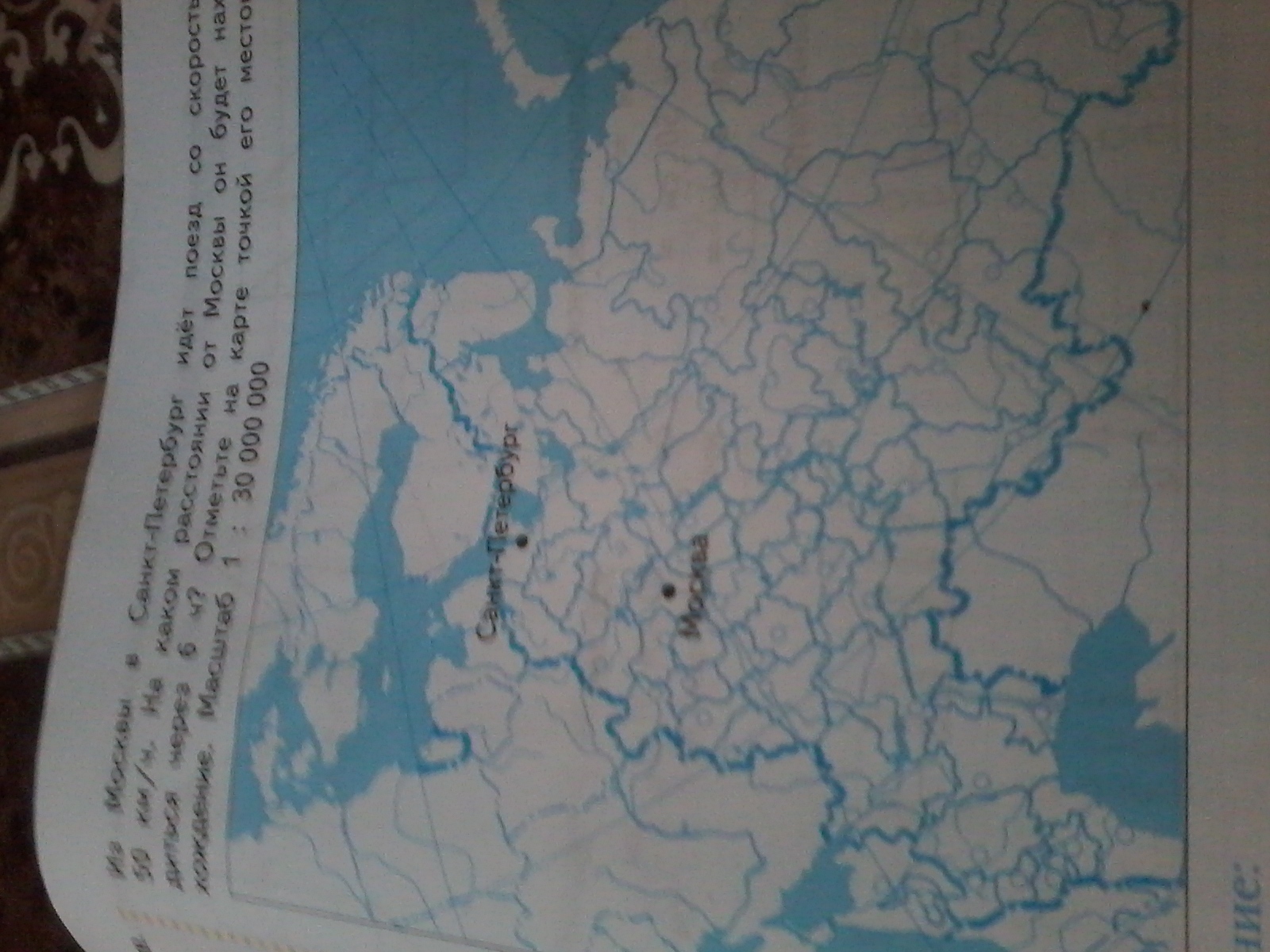Из Москвы в Санкт-Петербург идет поезд со скоростью 50 км/ч.на каком расстоянии от Москвы он будет находиться через 6 часов?Отметьте на карте точкой его местонахождение.Масштаб 1:30 000 000.
