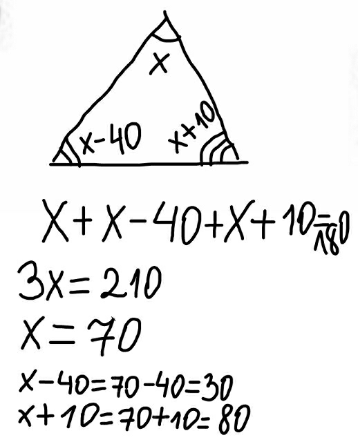 первый угол = 70, второй = 30, третий = 80 - он больший