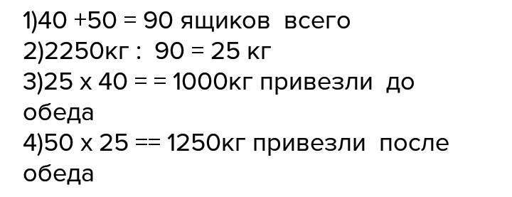 до обеда на овощную базу привезли 40 ящиков яблок после обеда еще 50 таких же ящиков всего 2 тонны 250 кг яблок вычисли массу яблок привезенныйх до и после обеда