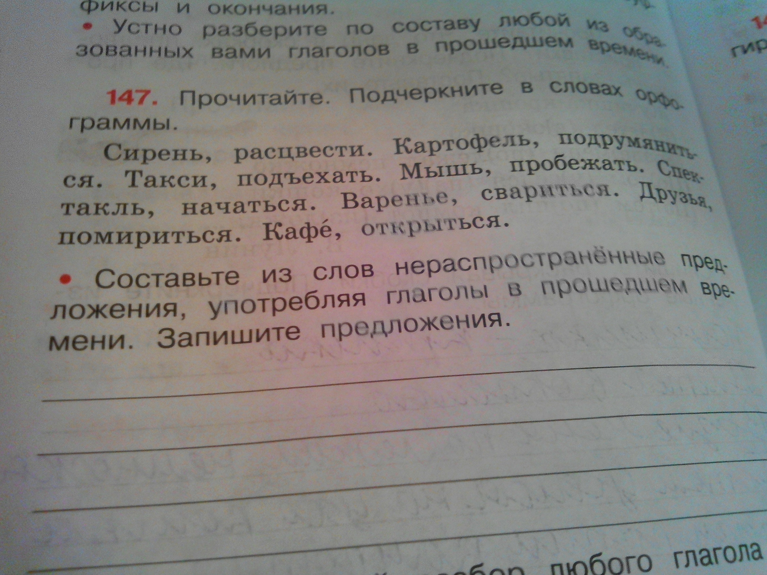 Сирень расцвела. Картофель подрумянился. Такси подъехало. Мышь пробежала. Спектакль начался. Варенье сварилось. Друзья помирились. Кафе открылось. Орфограммы: подъехало - ъ, мышь - ь, начался - ча, варенье - ье, друзья - ья. Вроде всё.