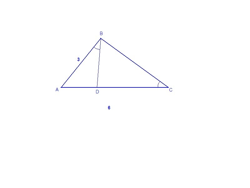 на стороне AC треугольника АВС отметили точку D так.что угол АBD равен углу ВСА.Найти отрезки на которые точка D делит сторону АС если АВ=3см АС=6см ЗАРАНЕЕ СПАСИБО