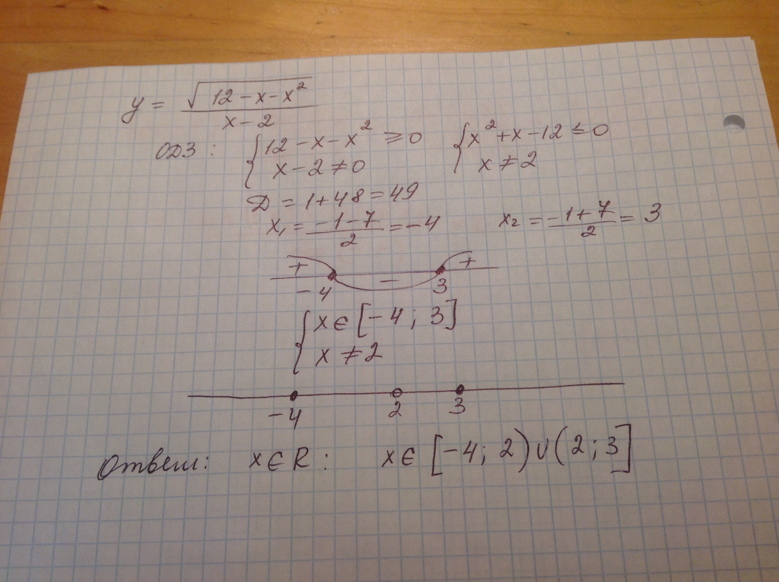 найдите область определения функции y = sqrt (12-x-x ^ (2))/(x-2)