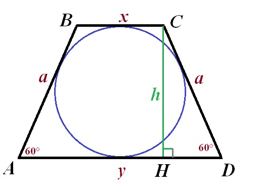Боковая сторона равносторонней трапеции, описанной вокруг круга, равна а,а один из углов равен 60 градусов. Найдите площадь трапеции