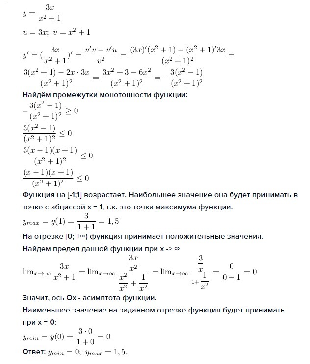 Помогите пожалуйста найти наименьшее и наибольшее значение функции f(x) на отрезке [a;b] y=3x/(x^2+1) [0;5]