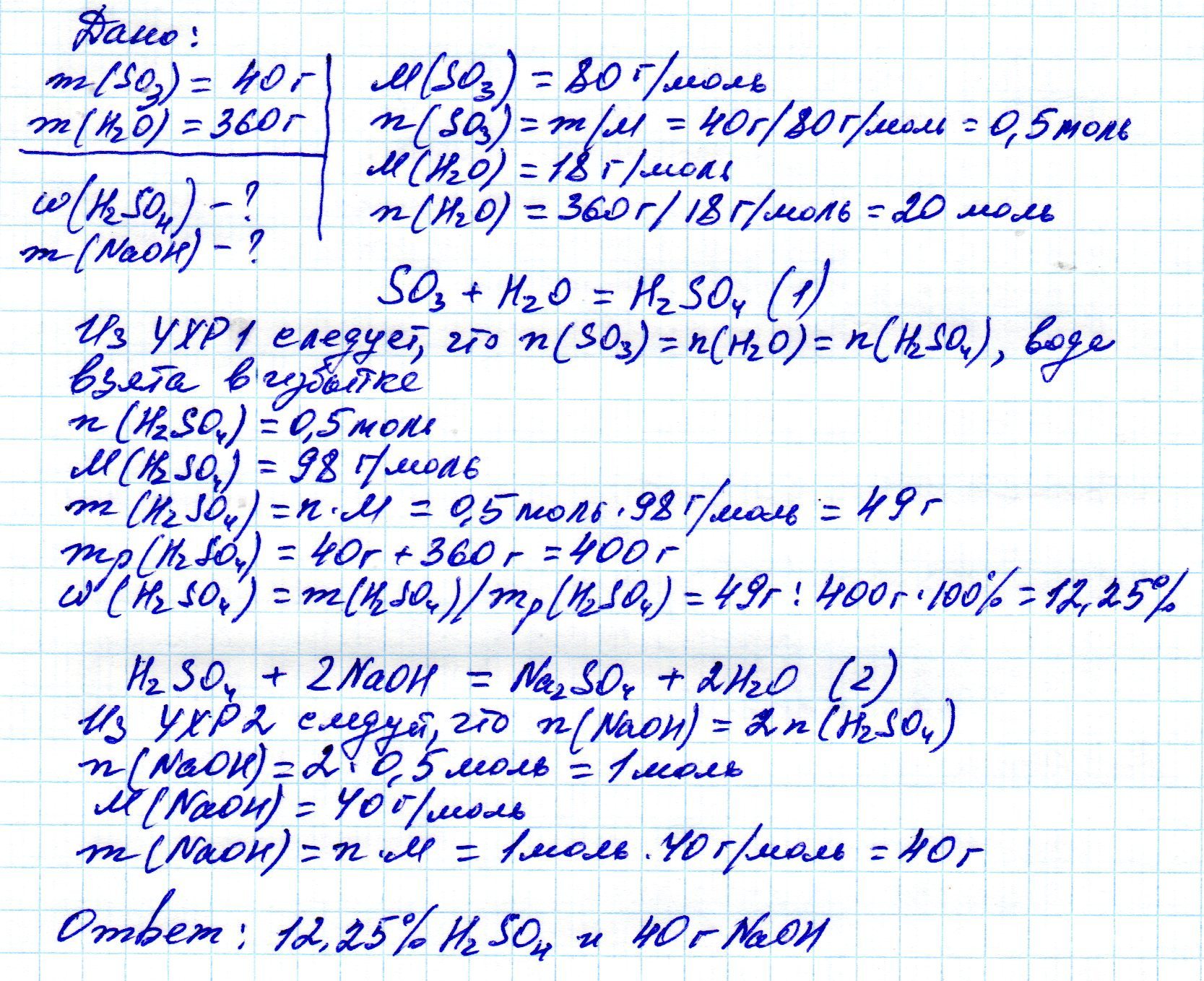 Оксид серы (VI) массой 40 г растворили в 360 г воды. Рассчитайте массовую долю серной кислоты в полученном растворе и массу гидроксида натрия, необходимого для полной нейтрализации этого раствора.