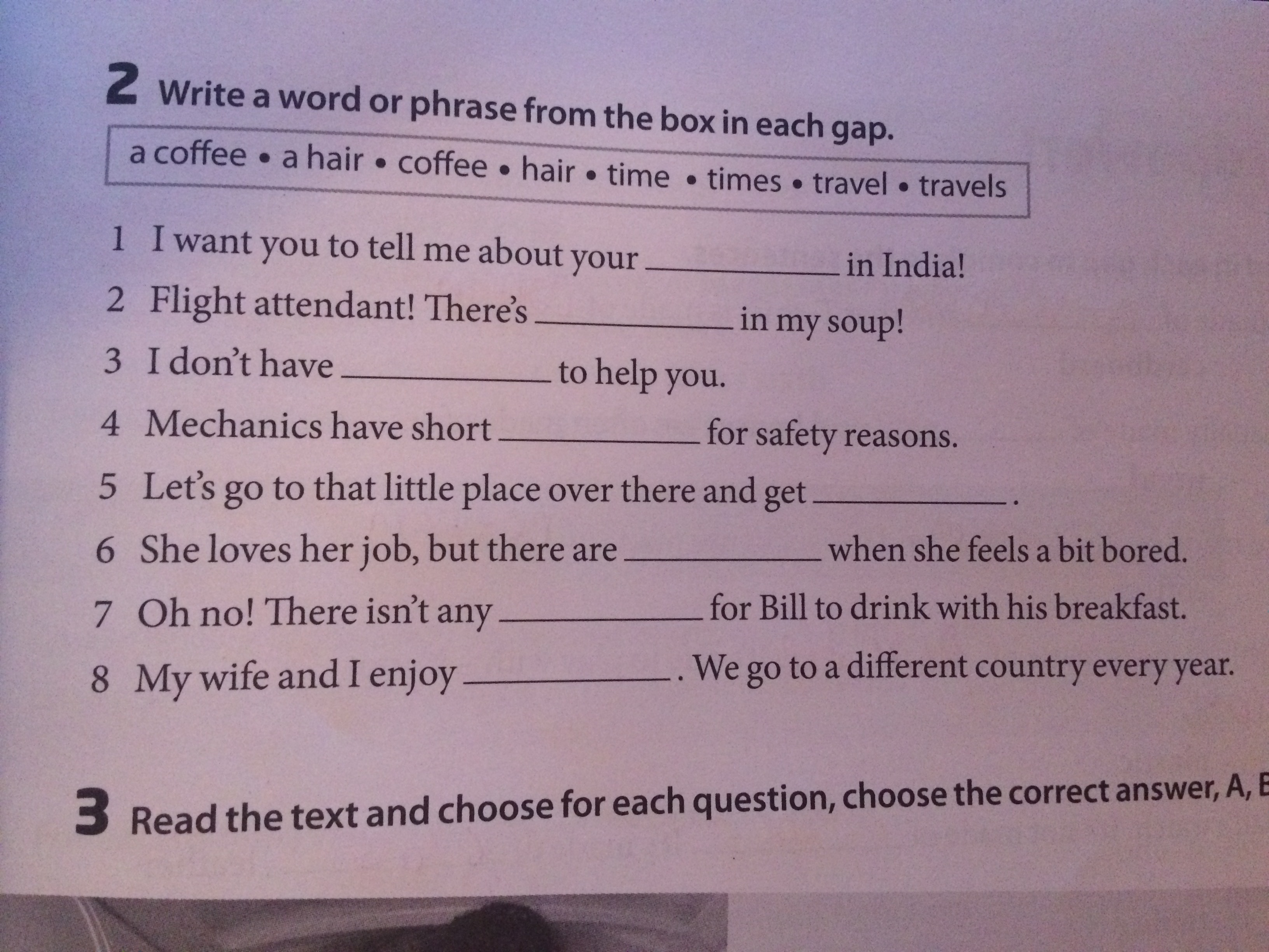 1 travel 2 a hair 3 time 4 hair 5 a coffee 6 times 7 coffee 8 travels