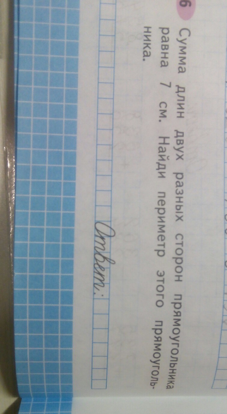 Сумма длин Двух разных сторон прямоугольника равна 7 см. Найди периметр этого прямоугольника.