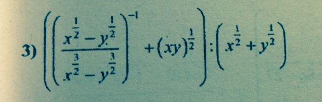 1) ((x^(1/2)-y^(1/2))/(x^(3/2)-y^(3/2)))^(-1) = (x^(3/2)-y^(3/2))/(x^(1/2)-y^(1/2)) = (x^(1/2)-y^(1/2)*(x+(xy)^(1/2)+y)/(x^(1/2)-y^(1/2))=x+(xy)^(1/2)+y