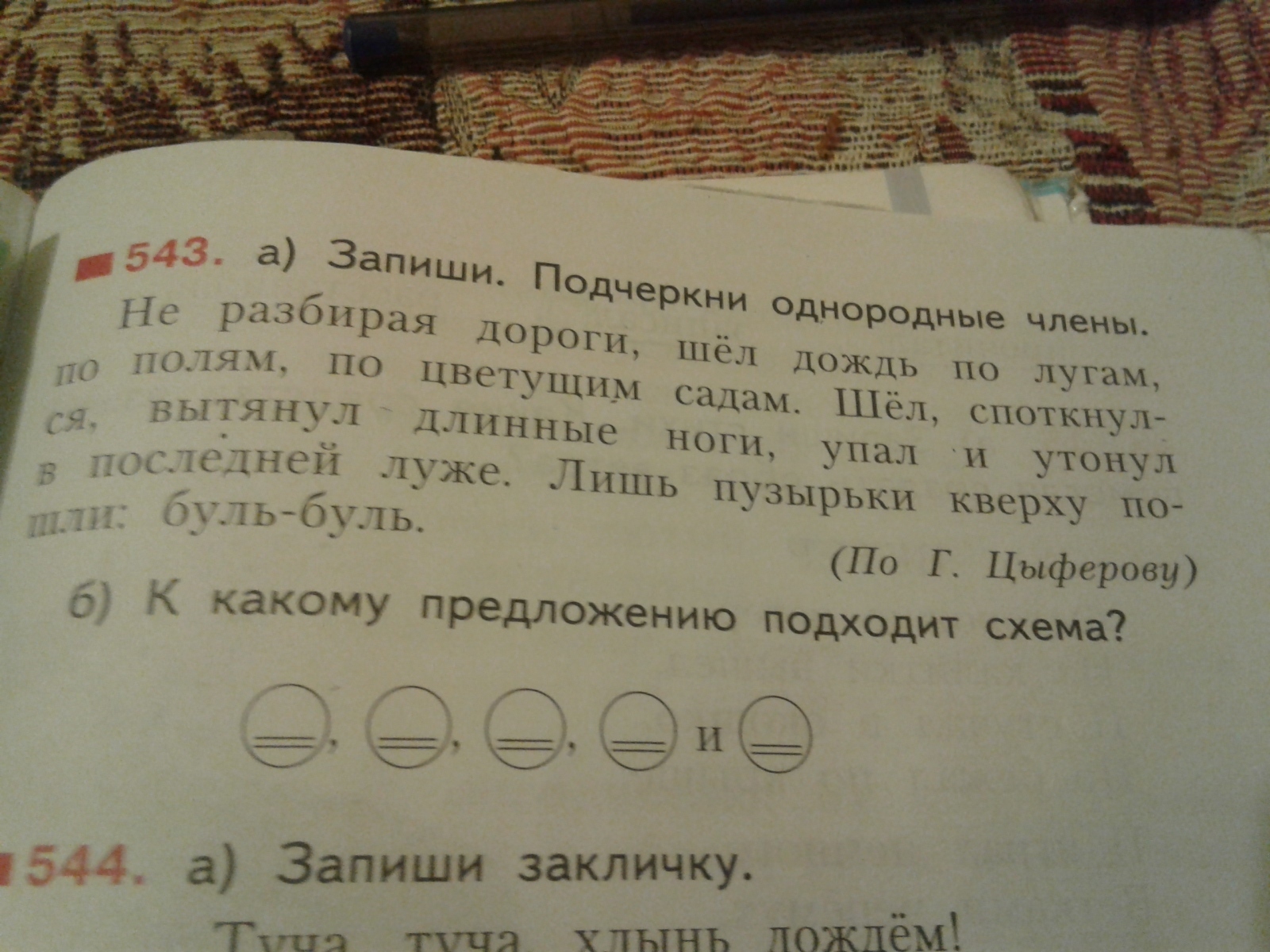 Однородные члены: по лугам, по полям, по цветущим садам. Шёл, споткнулся, вытянул, упал и утонул.