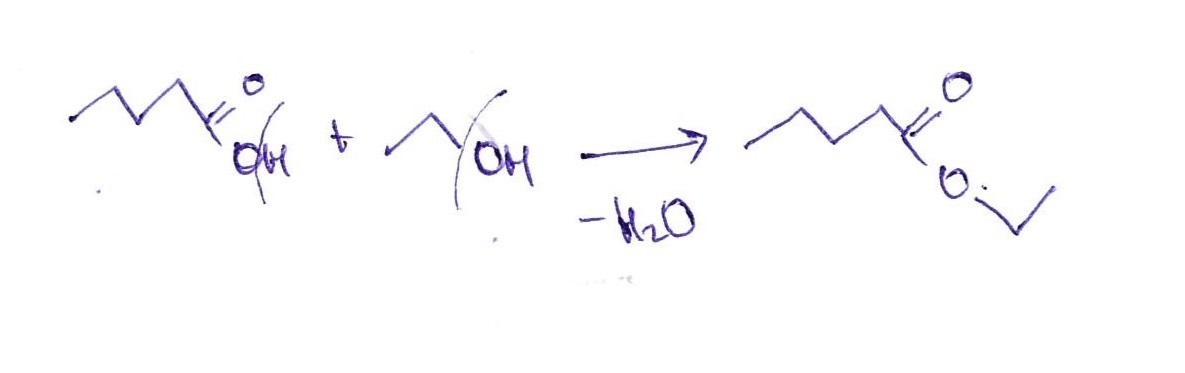у кислоты(там где OH) уходит водород, остается O с минусом, у спирта - ОН . H+OH=H2O(уходит). на минус кислоты цепляется спирт, тем местом откуда ушла OH.