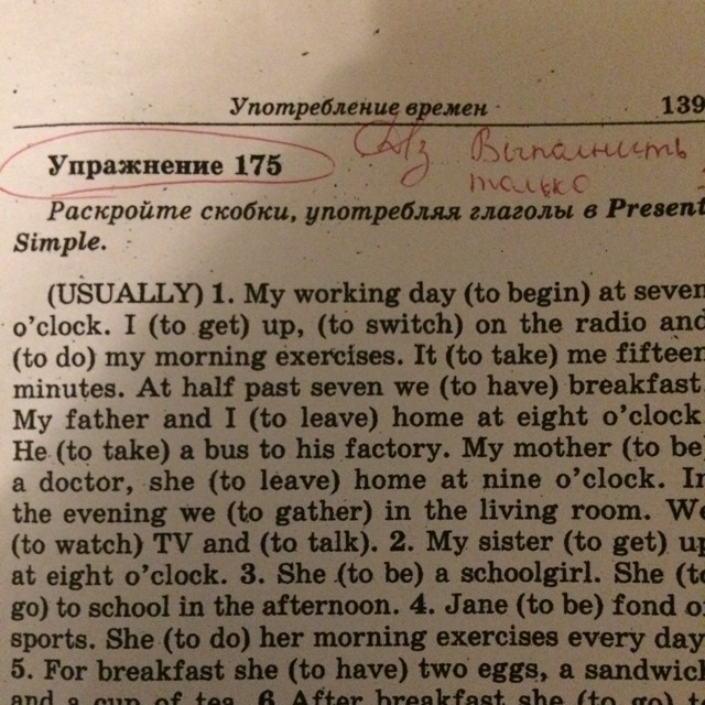 1. My working day begins at seven o'clock. I get up to switch on the radio and to do my morning exercise. It takes me fifteen minutes. At half past seven we have breakfast. My father and I leave home at eight o'clock. He takes a bus to his factory. My mother is a doctor, she leaves home at nine o'clock . In the evening we gather in the living room. We watch TV and talk.