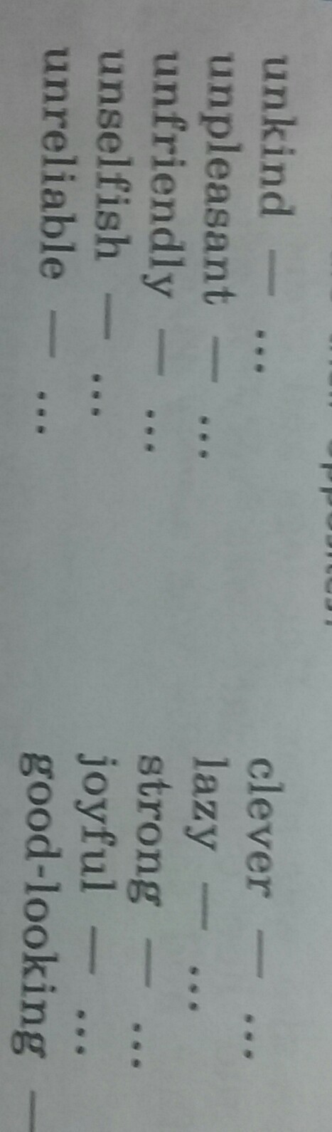 unking- kingunpleasant-pleasantunselfish- selfishunreliable-reliableclever-stupidlazy-hard-workingstrong-weakjoyful-sadgood-looking- bad-looking