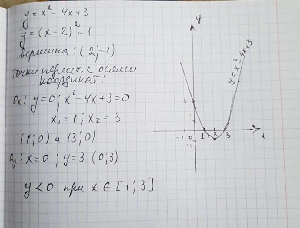 Построить график функции y= x²- 4x +3 и найти значения х при которых функция принимает отрицательные значения.