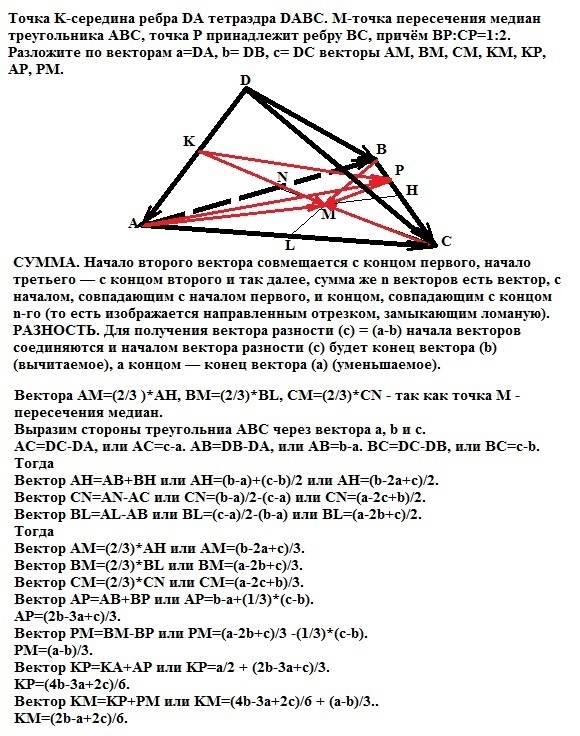 Точка K-середина ребра DA тетраэдра DABC. M-точка пересечения медиан треугольника ABC, точка P принадлежит ребру BC, причём BP:CP=1:2. Разложите по векторам а=DA, b= DB, c= DC векторы AM, BM, CM, KM, KP, AP, PM