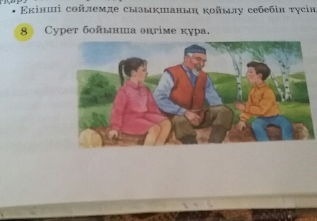 Атасы немерелеріне өз ақылын бастан кешкен оқиғаларымен дəлелдеп, айтып отыр. Самат пен Айзере атасының ақылын қызыға тыңдауда. Бірде Самат атасының сөзін бөледі. Сонда атасы жəй гана " Əрбір істерің өздеріңе сынақ емес,сабак болсын ",-деді.