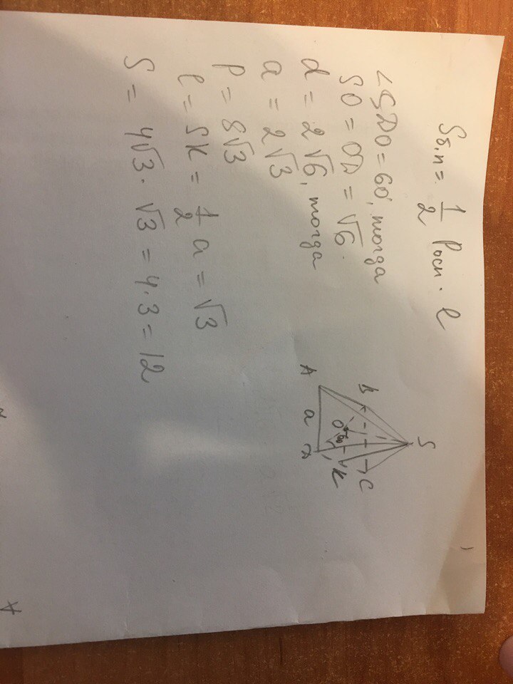 основание правильной пирамиды является квадрат.Высота пирамиды равна √6 см,а каждое боковое ребро наклонено к плоскости основания под углом в 60 градусов . найдите площадь боковой поверхности