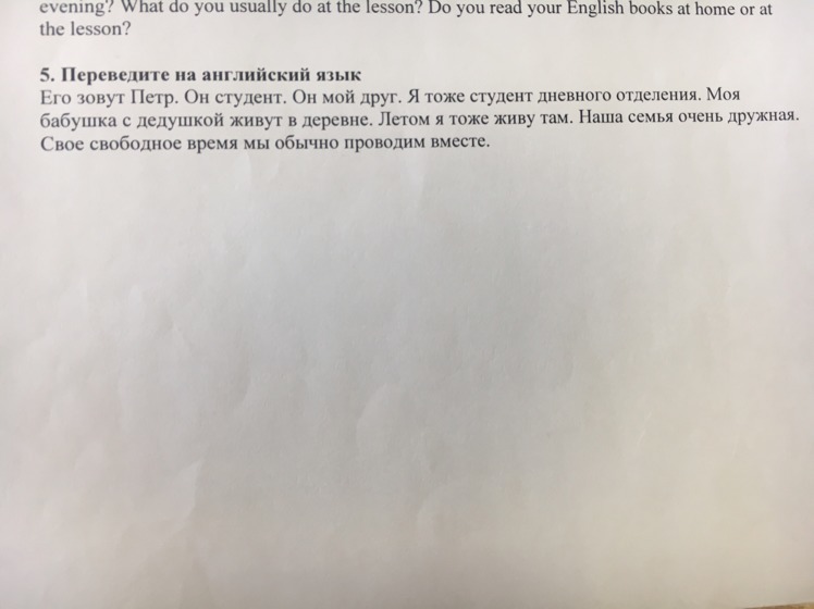 His name is Peter. He's a student. He's my friend. I'm a student of a full-time department too. My grandma and grandpa are live in the village. In the summer I live there too. Our family is very amicable. We usually spend our free time together.