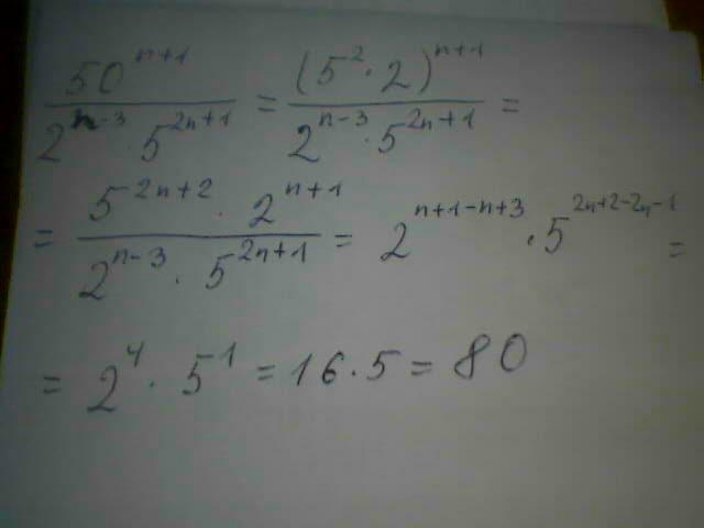 Сократите дробь:50 в степени n+1 деленное на 2 в степени n-3 умноженное на 5 в сепени 2n+1...Помогите пожалуйста