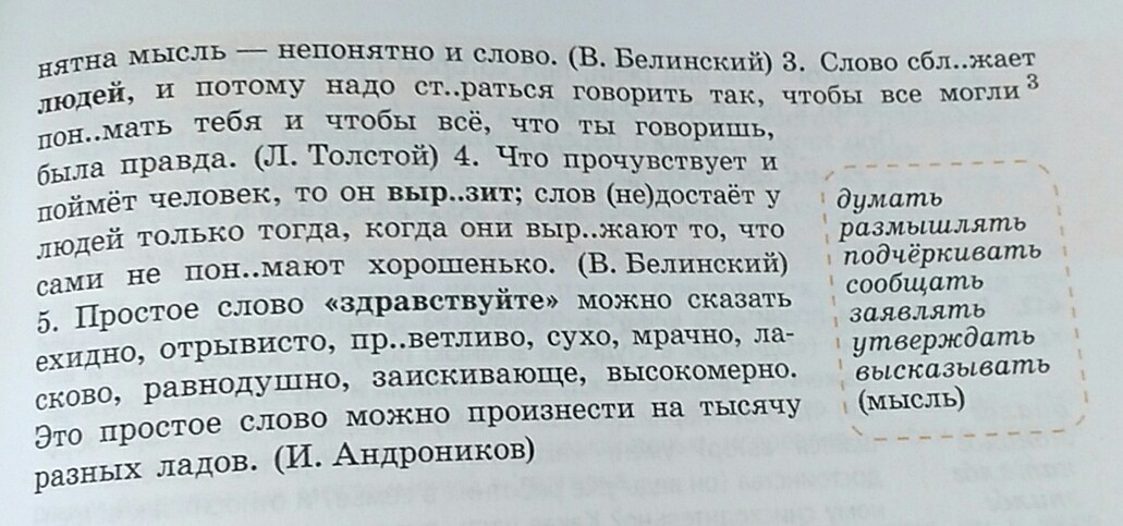 4. «Что прочувствует и поймёт человек, то он и вырАзит, – размышляет В. Г. Белинский и поясняет: – Слов недостаёт у людей только тогда, когда они вырАжают то, что сами не понИмают хорошенько».
