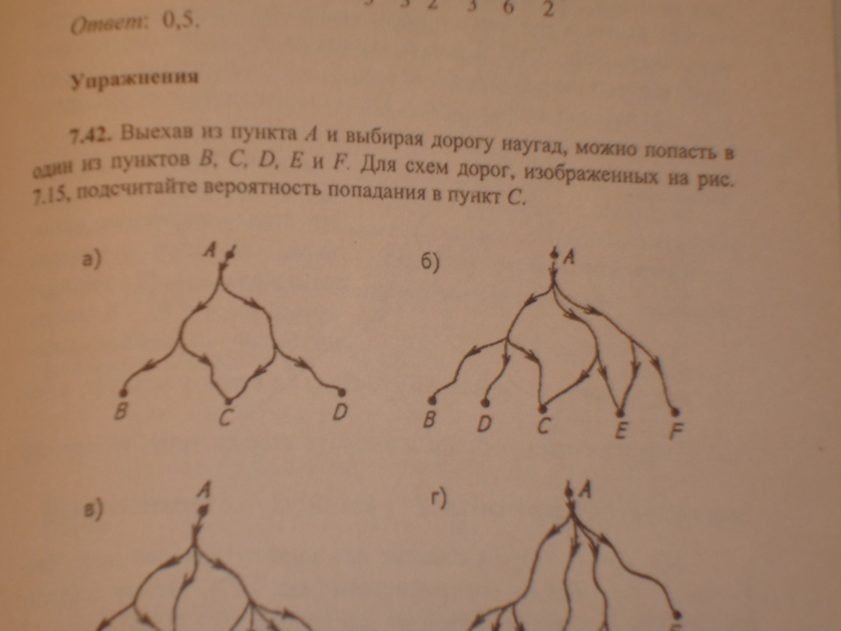 7.42 б) рис 2(б) Выехав из пункта А и выбирая дорогу наугад, можно попасть в один из пунктов B, C, D, E, F. Для схем дорог, изображённых на рис 2(б), подсчитайте вероятность попадания в пункт С.