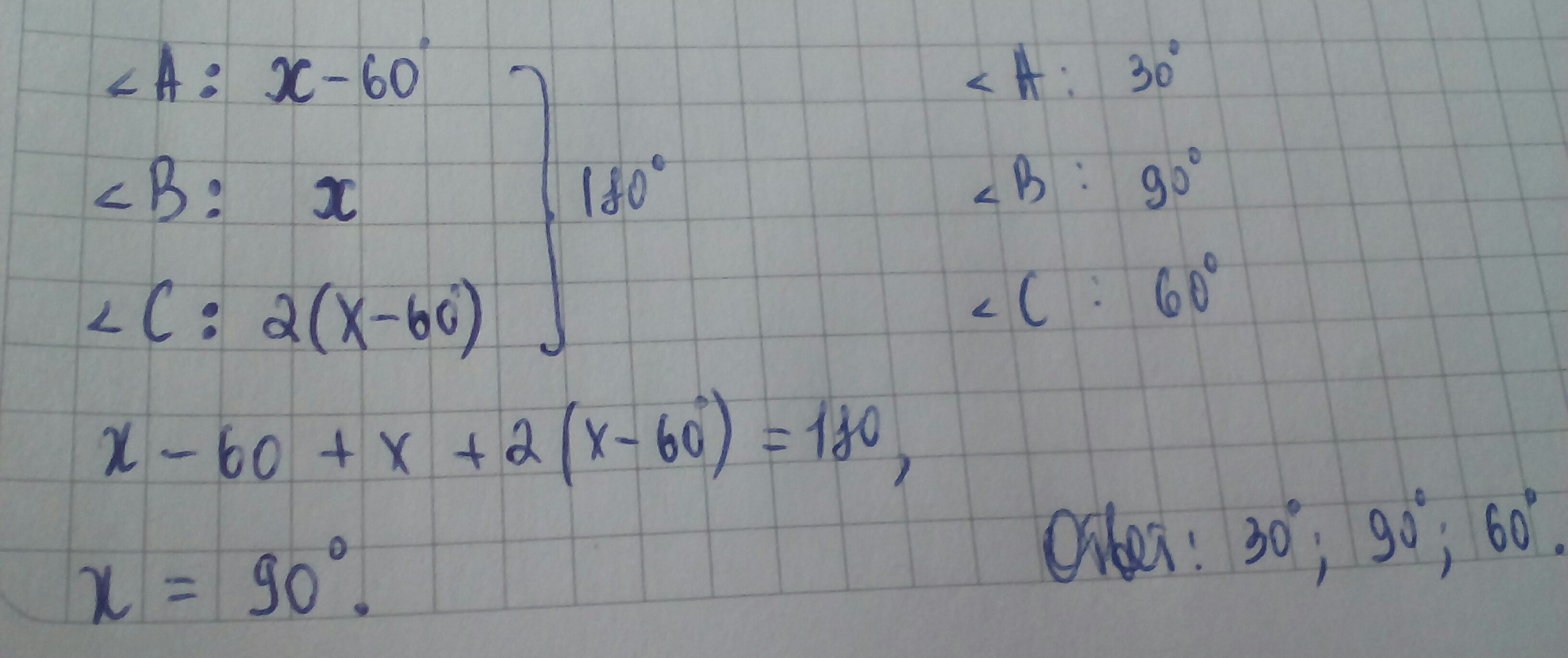 Найдите углы треугольника ABC , если угол А на 60 градусов меньше угла B и в 2 раза меньше угла C